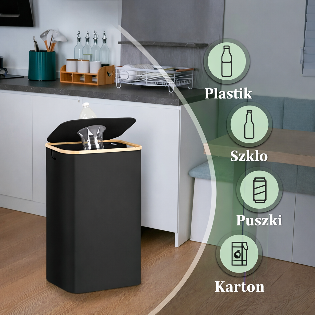 Kosz sprawdzi się do przechowywania różnych opakowań – plastikowych butelek, szkła, puszek oraz kartonów. Pomaga utrzymać porządek i ułatwia segregację odpadów.